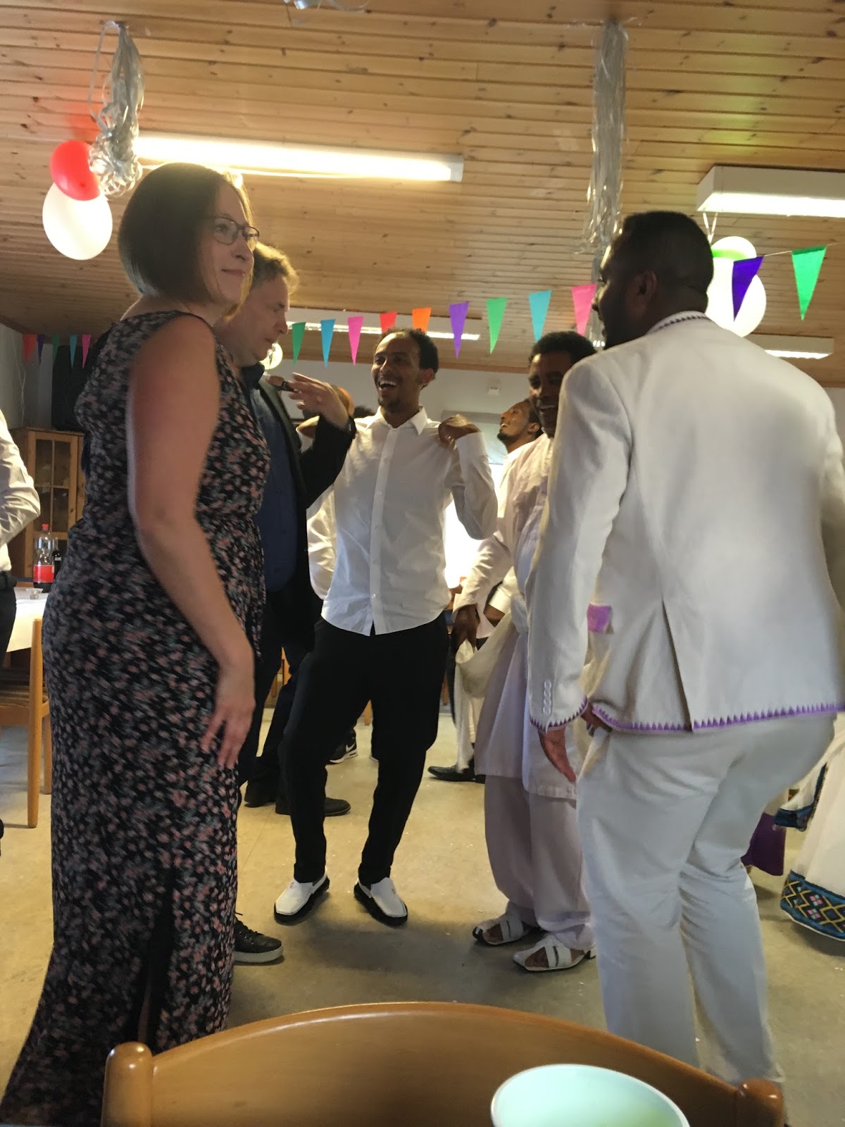 Vi blev bjudna på lunch, traditionell Eritreansk mat med flera rätter bla kyckling, kryddat ris, en vegetarisk rätt med potatis och grönsaker, och två olika köttgrytor. Det lades upp på en injera som är en sorts pannkaksliknande tunnbröd och man äter rätten traditionellt med höger hand. Mycket gott och ena grytan var härligt kryddstark.